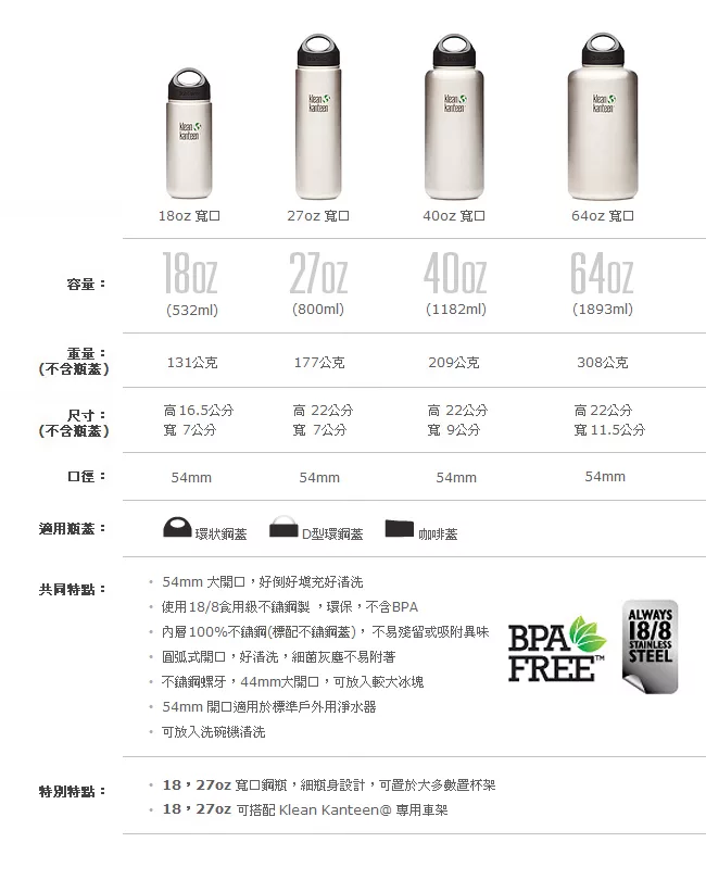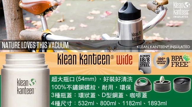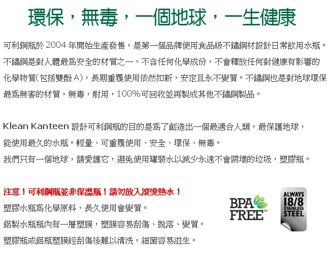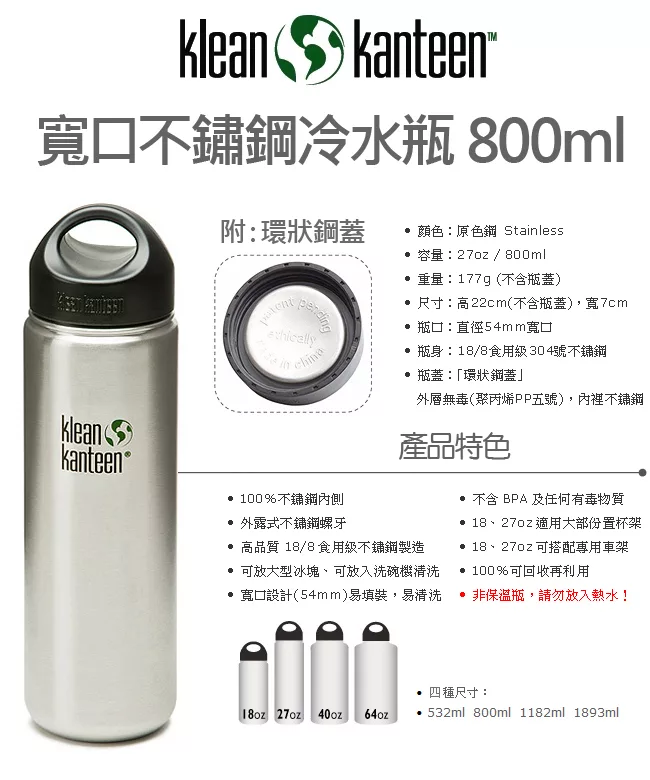 美國Klean Kanteen 寬口不鏽鋼冷水瓶800ml 原鋼色 評價