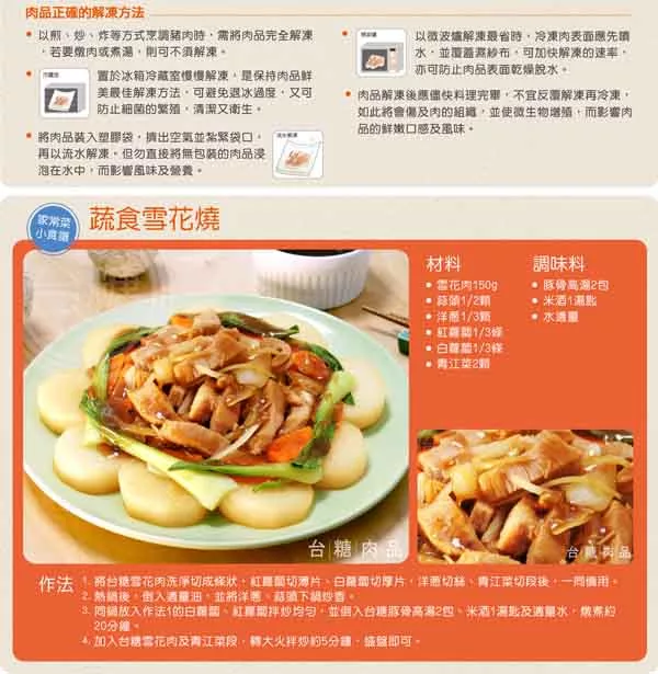 台糖雪花肉為高級食材,一頭豬僅有二片約六兩重,俗稱黃金六兩肉,一般亦稱為松阪肉或霜降豬肉,
